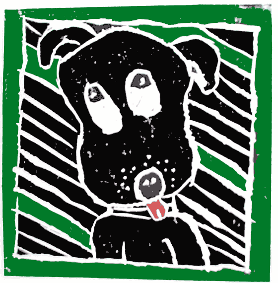 Linocut print of cute dog by one of the project students. Is that a tear escaping? Would you take this dog home?