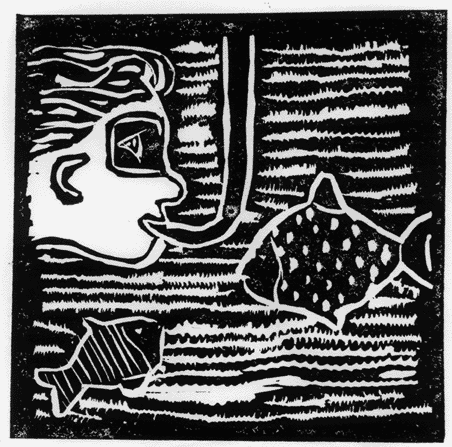 Linocut print of snorkeling by one of the project students. Ever been snorkeling or scuba diving? When? What happened?