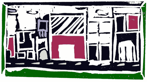 Linocut print of a city scape by one of the project students. Is your city green, grey, or ghastly ? Write about it.