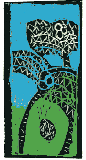 Linocut print of a falling coconut by one of the project students. Boing! A coconut lands on ....... ? I wonder what?