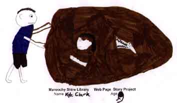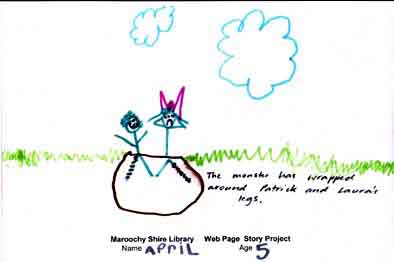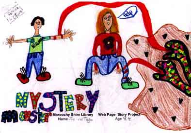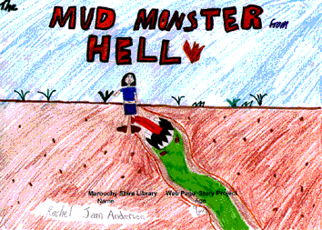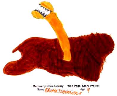One day at Mountain Creek, near Mooloolabah, on the coast in the south east corner of Queensland, Australia - two students, Laura and Patrick, were on their way to school. Mountain Creek once was full of beautiful wallum heath and paperbark swamps but now lots of houses and roads are being built. They were walking past the swampy area in the low part of the school playground when one of them, Laura, got a bit too close and slipped over in the mud, spllaaatt! and went sliding along into the deepest part of the swamp. ![]() Mud went splashing up her legs. There were bits of grass and slime everywhere. She even saw a leech start to climb onto her hand. She went, "Aaaaaaaahhhhh!" Her boyfriend Patrick said, "Laura. Are you OK?" She said, "I think so," but, as she started to stand up in the mud, she slipped over again. Patrick reached out to grab her but he fell in too. He went, "Eeeeeeeeeeh!" and slid into the middle with Laura. Every time they tried to stand up they fell over again and got more and more covered in mud and deeper and deeper into the swamp. As Laura rolled over in the mud to try to stand up again she felt something slimy wrap around her leg. She screamed. "Aaaaaaaahhhhh. Patrick. Something's got my leg! Ooooooohhhhh!" Patrick reached down into the mud to try and free Laura and he felt something soft that wrapped around his hand and started to pull him in. He cried out, "Help me! Help me! It's got me now!" Laura reached down and helped Patrick pull and pull until they pulled up a long slimy thing like a giant tongue. It was the same colour of the mud but every now and then there were flashes of bright orange and pink and green as it moved. All of the time it was trying to pull them under. Patrick said, "Let's pull together. One, two, three pull!" They both pulled together but, no matter how hard they tried, the giant tongue was pulling them further into the mud. Patrick was up to his waist now and he felt sharp teeth grab him around his ankle. He said, "Ah. No. It's mouth. It's teeth. It's got my foot. Help!" Just then Laura saw Patrick's Swiss Army pocket knife sticking out of his shirt pocket. She grabbed it, opened out a blade and went slash, hack, stab into the tongue. The tongue let go and slithered back into the mud as its blood came spurting out. Laura said, "Come on. Let's get out of here. They staggered and slid through the mud and out onto the grass." They ran up to the school. Their teacher saw them coming. She said, "Look at you. You're covered in mud. Didn't I tell you not to play in that mud again." They said, "Something got us. It wasn't our fault. There's a dinosaur or something in the swamp!" Their teacher said, "Oh yeah. You tried that trick last week. Now. Go to the sink and wash yourself straight away. Come on. Enough of those stories." When Patrick and Laura were washing the mud off they whispered to each other, "We'll have to convince her somehow." Patrick said, "Hey. What about the tooth marks in my ankle?" So when they got back into the classroom Patrick rolled up his jeans and said, "Look." Sticking out of his ankle was a tooth. The teacher said, "My goodness. That's big enough to be a tooth of a dinosaur." She said, "Where did you get that tooth Patrick? Now stop playing tricks." They told the story again and the teacher decided she'd better have a look, so they went down to the swamp. Their teacher said, "Keep well back there. Just point out where you were." Laura said, "Over there. Look you can see Patrick's pocket knife on the mud." The knife was lying on the mud but it was all chewed up with little bits of pink and green slime all over it. It was like something had tried to eat it but spat it back up because it was too hard. The teacher said, "My goodness. Something has happened." Patrick said, "Can I go and get my pocket knife Miss?" She said, "No! Definitely not. Now everyone back to the class room quickly. Come on." When everyone was sitting in their chairs the teacher went up to the principal's office and after a while the students saw them both come back pointing at the pocket knife and looking at the strange tooth. Well before morning break the groundsman put up a bright orange safety fence 50 metres all around the swamp. That afternoon a low-loader truck with a big excavator on the back pulled up in the parking lot. The students watched as the excavator crawled over to the swamp and started to dig a deep hole where the thing had been. They didn't find anything that day or the next even though they dug up the area thoroughly. Finally the foreman signalled to the excavator driver to stop digging. He pulled the bucket up high and started to drive out of the swamp but before he got very far it started to lurch to one side and the mud went Sluuurrrppp! Bloooop, blooop, burrrp! The excavator slipped down, down into the mud. The driver just managed to scramble out of the cab and up onto the high bucket arm as the mud covered the excavator over. He jumped off the bucket and slipped and slid through the mud and onto the grass. All that was left of the excavator was the arm with the bucket sticking out of the mud. And, if you go out to the Mountain Creek School up on the Sunshine Coast, you'll probably still see that bright orange claw of the excavator sticking out even now because I don't think they'll ever get it out. (This story was created as part of a 1997 Children's Book Week session organised by Laney Robinson at Maroochydore Library with year four students from the Mountain Creek State Primary School and pre-schoolers from Eumundi Preschool on Thursday, 21st August, 1997.) (The drawings above - coloured pencil and felt pen - were contributed by Rachel Jean Anderson - age 9yrs, Nikki Toscan - age 9, Renee Leigh Moore - age 9 Turning 10, Kyle Clark - age 9, Zoe-Lee Taylor - age 9 1/2, Madeline - age 5, April - Age 5, James Mitchell - Age 9, Chris Simmons - Age 9.) (Other drawings contributed but not published - too many to include all - Katie, 