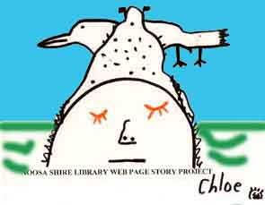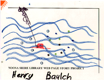 Once upon a time, down on a jetty at Pelican Beach, Noosaville, an old fisherman sat holding his fishing rod and staring out across the river. You could tell he had been there a long time because on his hat there was a large pile of pelican and seagull poop. Every day the pelicans and seagulls would come and sit on top of his hat. The man had been there so long that he would forget to shoo them away, and his hat became white and stained. When people walked to the end of the jetty and stood next to the really old man, they would say, "Oooooh! Yuck! What's that smell?" They'd look at the really old man and say, "It's coming from him! Let's get out of here!" And they'd walk away. One day, somebody new walked along the jetty - a woman called Jackie.She wore a dark hat and carried a bucket of water. She walked right up to the very old man, and what do you think she did? She poured the bucket of water 'FWSSSSSSH' all over his head. The pelican poop washed down over his clothes onto the jetty, and dribbled down through the cracks into the river. All the little fish went nibble, nibble, nibble eating it up. As the water ran down his shirt, the very old man woke up, and he said, "Help! Help! What's happening to me?" Jackie said, "Oh, I thought you needed a bath. You smelled so bad that all the people were running away from you." The old man stood up. His knees went 'EEAARRGGHH!' as he took his first steps for many years. As he turned around, he said. " Aaarrrghh! What's happened? What are all those buildings doing here?" Jackie said:"Well, you have probably been asleep for 200 years! Everything's changed." "Oh, no!" said the old man. He looked down at his fishing line and said: "I haven't even caught any fish." He reeled in his line and at the end of the line there was - guess what? - a brand new hat! He took it off the line and put it on his head and walked along the jetty with Jackie. She took him home to her house and said "Come on old man. You can live here if you catch a fish every day and don't let the pelicans poop on your hat." Well that's what he did. He went fishing every morning wearing his new hat. The only ones who were sad down at Pelican Beach were the pelicans, because they had to perch on the poles, piles and boats again. All contents copyright (C) 1997, Daryll Bellingham. All rights reserved. Please contact me for more information. (This story was created as part of a 1997 Children's Book Week session organised by Maureen O'Shea at Noosa Shire Library Wednesday, 20th August, 1997.) (The drawings above - felt pen - were contributed by Chloe and Henry Baulch. Thank you very much to all the children who helped create the story and submitted other illustrations. ) |