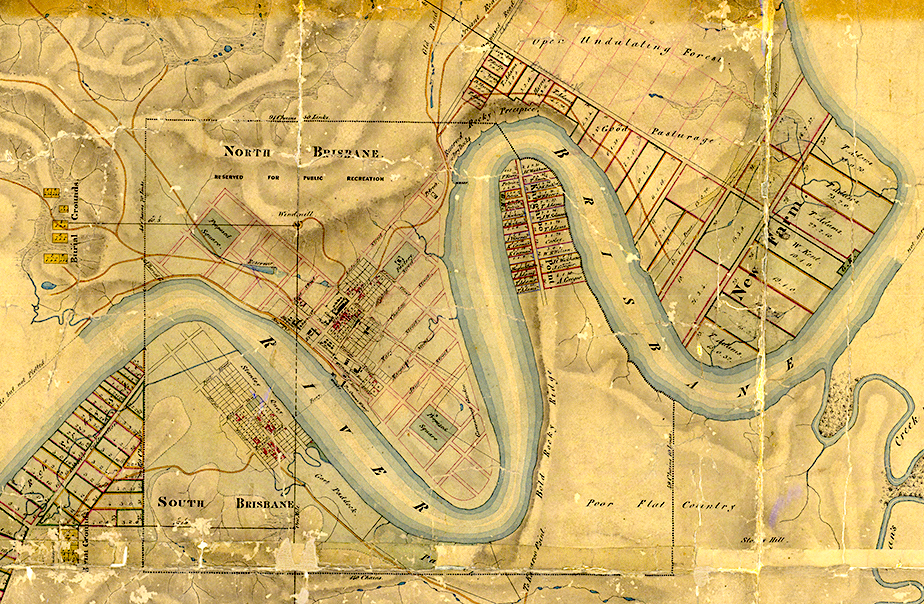 It is possible that when Henry Wade surveyed the boundaries for the town of Brisbane at Meanjin in preparation for it being described under the Police Towns Act, he took into account the then localities of Aboriginal camps. Ray Kerkhove's work justaposing the location of Aboriginal camps with these surveyed boundaries shows how close these boundaries were to the existing camps. For example, the south east boundary, which in later years became Wellington Road, intersects with the river adjacent to a camp at what was to become Mowbray Park. Another camp was situated on a ridge immediately to the south of the Town Boundary that was to become Vulture Street.