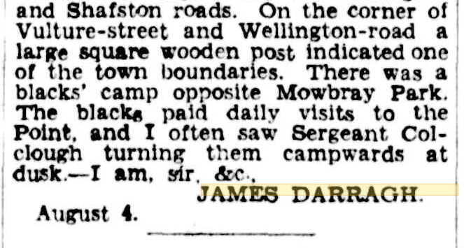 'On the corner of Vulture-street and Wellington-road a large wooden post indicated one of the town boundaries. There was a blacks' camp opposite Mowbray Park, The blacks paid daily visits to the Point, and I often saw Sergeant Collough turning them camp wards at dusk - I am, sir, &c., James Darragh.'