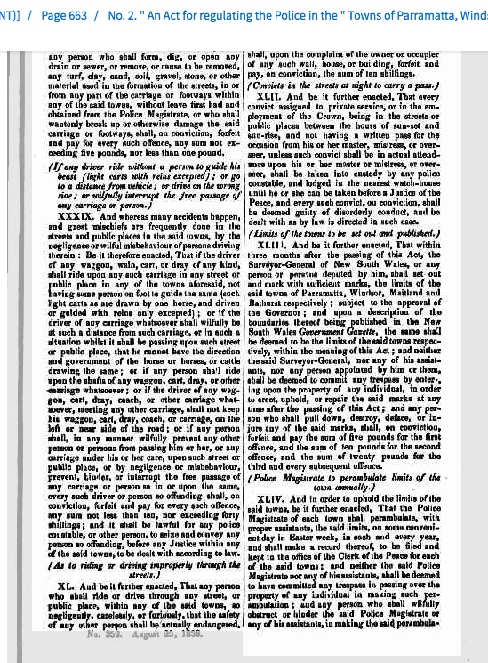 Passed and Gazetted as 'An Act for regulating the Police in the Towns of Parramatta, Windsor, Maitland, Bathurst, and other Towns respectively, and for removing and preventing Nuisances and Obstructions, and for the better alignment of Streets therein .'