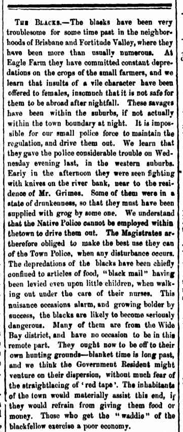 'The blacks were hunted out of the town by mounted police at sunset. Even so families going from Queen Street to the windmill on Wickham Terrace would make up parties because they were nervous of the Aborigines.' (http://nla.gov.au/nla.news-article183335944)