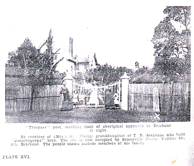 The photo shows what appears to be a wooden post approx 1 m high, just outside their fence line. It has a sharpened top, presumably to help preserve it from the weather. In the print in the book there appears to be some writing or illustration of some sort on the post. In the copy of the image held by Qld State Library, this can not be seen however and it may be a reproduction artefact. The photo was taken by Boag around 1872 before the railway line excavation that caused the Stephens family to move and rebuild Cummbooqueepa on it's current site in the grounds of Sommerville House. It has been suggested that the photo is possibly taken from Stephens Road and not from Vulture Street. If this was the case, it would throw some doubt over whether it was actually a "Trespass" post as claimed in 'Triumph of the Tropics'. However, a close examination of the three images currently available in the Picture Queensland collection would seem to make it more likely to be taken from Vulture Street. This would make it more likely that the post was on Vulture Street thus adding validation to the 'Trespass Post' claim.